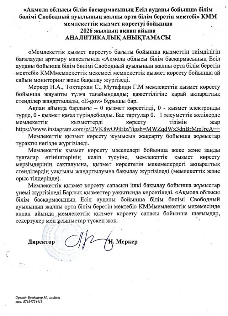 «Ақмола облысы білім басқармасының Есіл ауданы бойынша білім бөлімі Свободный ауылының жалпы орта білім беретін мектебі» КММ мемлекеттік қызмет көрсетуі бойынша 2026 жылдың ақпан айына АНАЛИТИКАЛЫҚ АНЫҚТАМАСЫ
