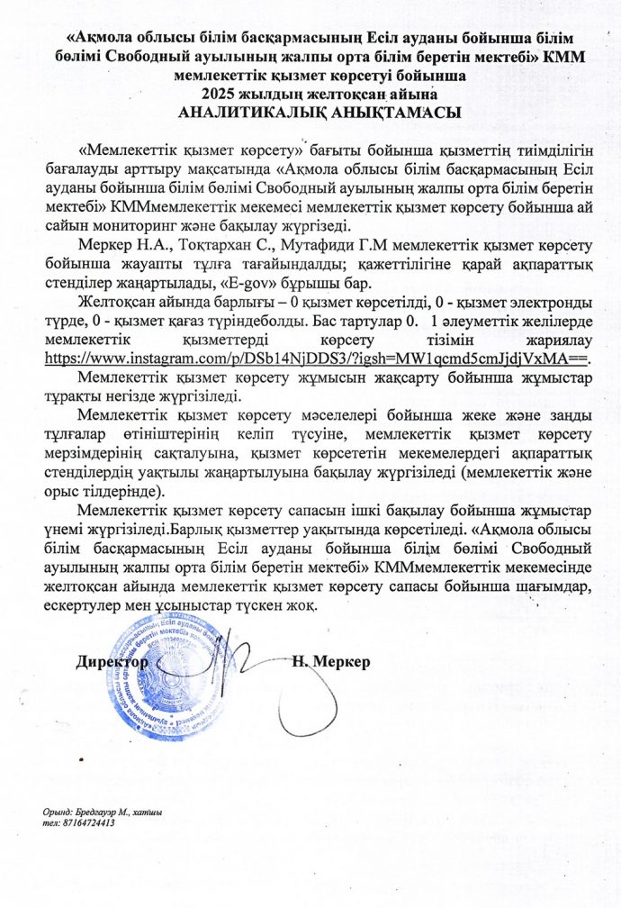 «Ақмола облысы білім басқармасының Есіл ауданы бойынша білім бөлімі Свободный ауылының жалпы орта білім беретін мектебі» КММ мемлекеттік қызмет көрсетуі бойынша 2025 жылдың желтоқсан айына АНАЛИТИКАЛЫҚ АНЫҚТАМАСЫ