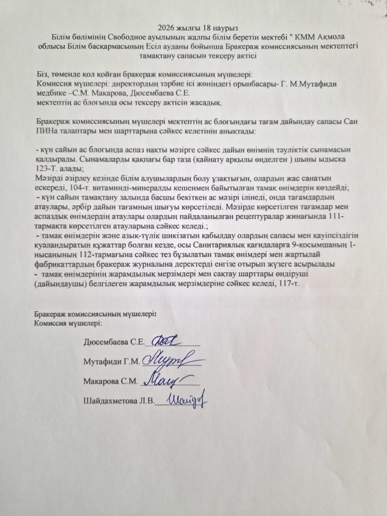2026 жылғы 18 наурыз Білім бөлімінің Свободное ауылының жалпы білім беретін мектебі " КММ Ақмола облысы Білім басқармасының Есіл ауданы бойынша Бракераж комиссиясының мектептегі тамақтану сапасын тексеру актісі