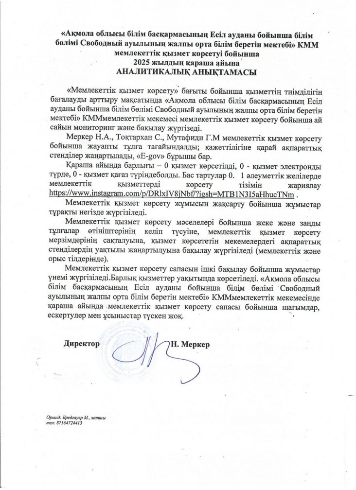 «Ақмола облысы білім басқармасының Есіл ауданы бойынша білім бөлімі Свободный ауылының жалпы орта білім беретін мектебі» КММ мемлекеттік қызмет көрсетуі бойынша 2025 жылдың қараша айына АНАЛИТИКАЛЫҚ АНЫҚТАМАСЫ