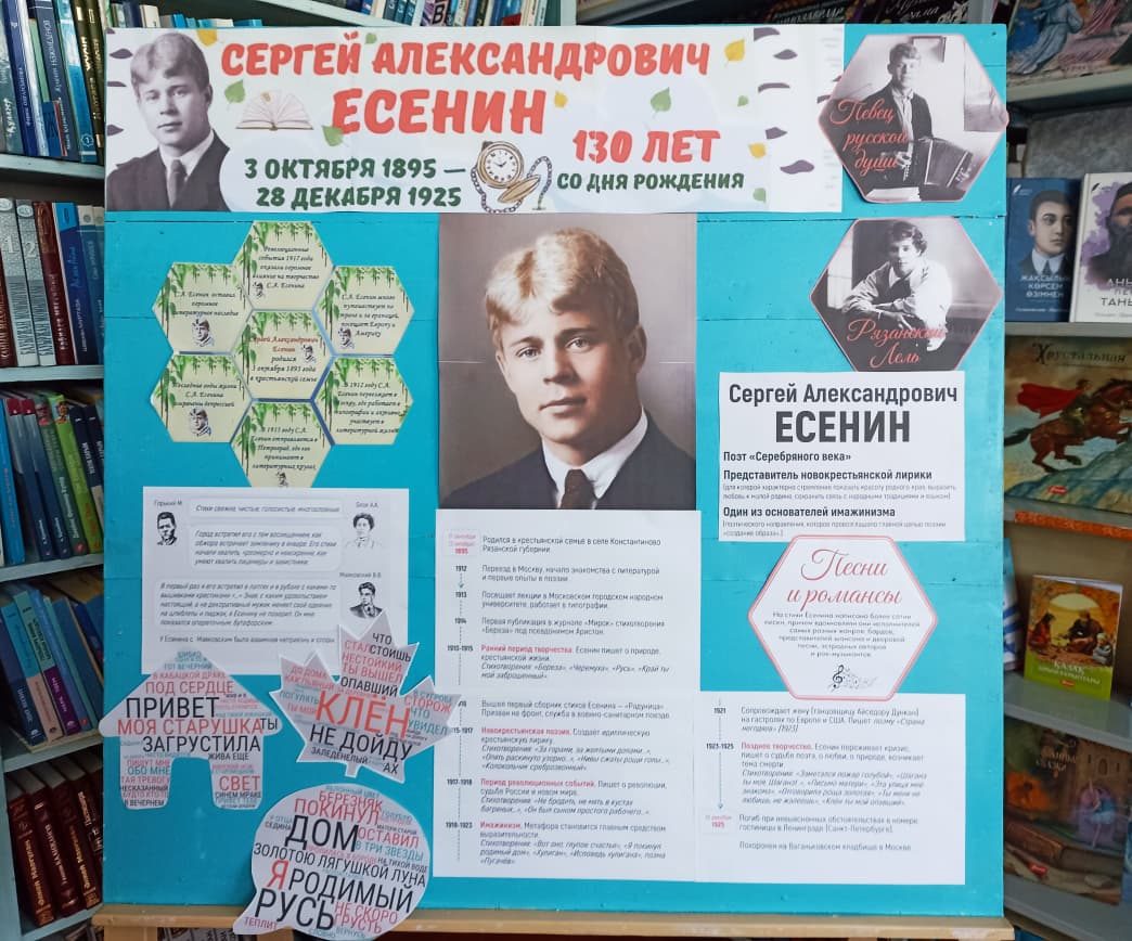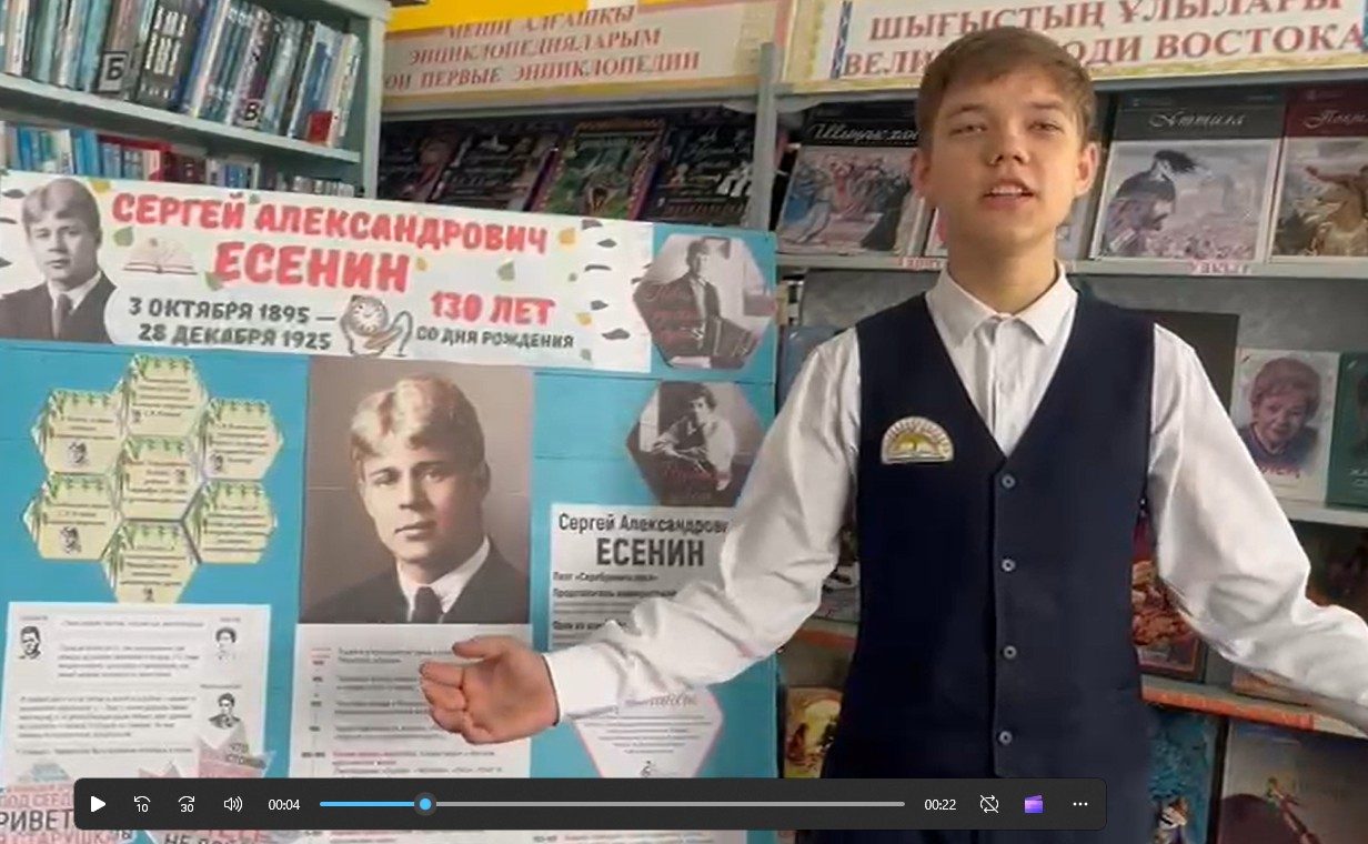3 қазанда шығармашылығы табиғатқа, туған жерге деген терең сүйіспеншілікке толы ұлы орыс ақыны Сергей Есениннің туғанына 130 жыл толды. Мектеп кітапханашысы кітап басылымдарына шолу жасап, ақынның өмірбаяны мен шығармашылығымен таныстырды, үлкен мәдени мұра қалдырған күрделі тағдырдың адамы - ақын туралы презентация көрсетті. Балалар Сергей Есениннің балалық шағы мен отбасы, лириканың ерекшеліктері, ақынның жеке өмірі мен қайғылы қазасы туралы қызықты мәліметтерді білді. 11 сынып оқушылары оның өлеңдеріне арналған романстарды тыңдады. Орыс тілі мен әдебиеті пәнінің мұғалімдері Н. А. Меркер, м.н. Ильгундинова 5, 11 сыныптарда "Есенин әлемінде" поэзия сағаттарын өткізді. Оқушылар оның махаббат, ана, табиғат, достық туралы өлеңдерін жатқа оқыды. "Қайың", "алтын тоғай көндірді", "өкінбеймін, шақырмаймын, жыламаймын" және т. б. өлеңдер.
