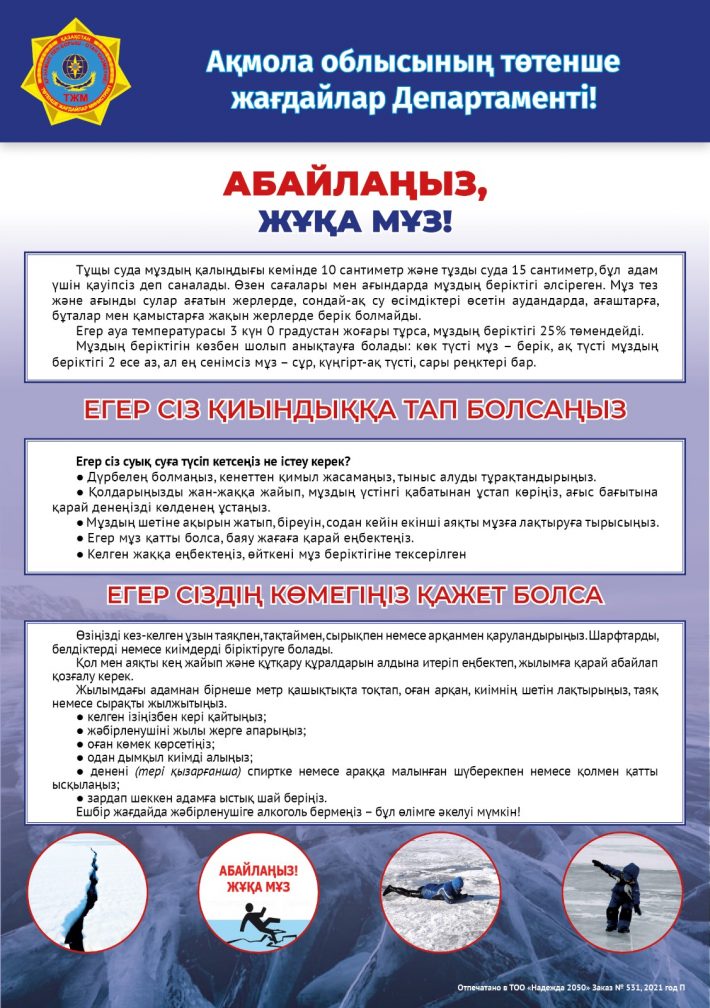 - Су объектілерінің жанында болған кезде, мұз үстінде жүру ережелерін сақтау. Белсенді еріту кезеңінде мұзға шығуға тыйым салынады.