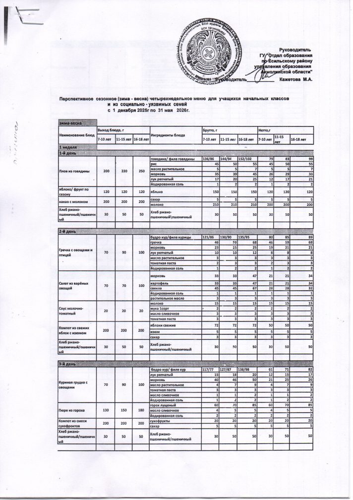 Перспективное сезонное (зима - весна) четырехнедельное меню для учащихся начальных классов