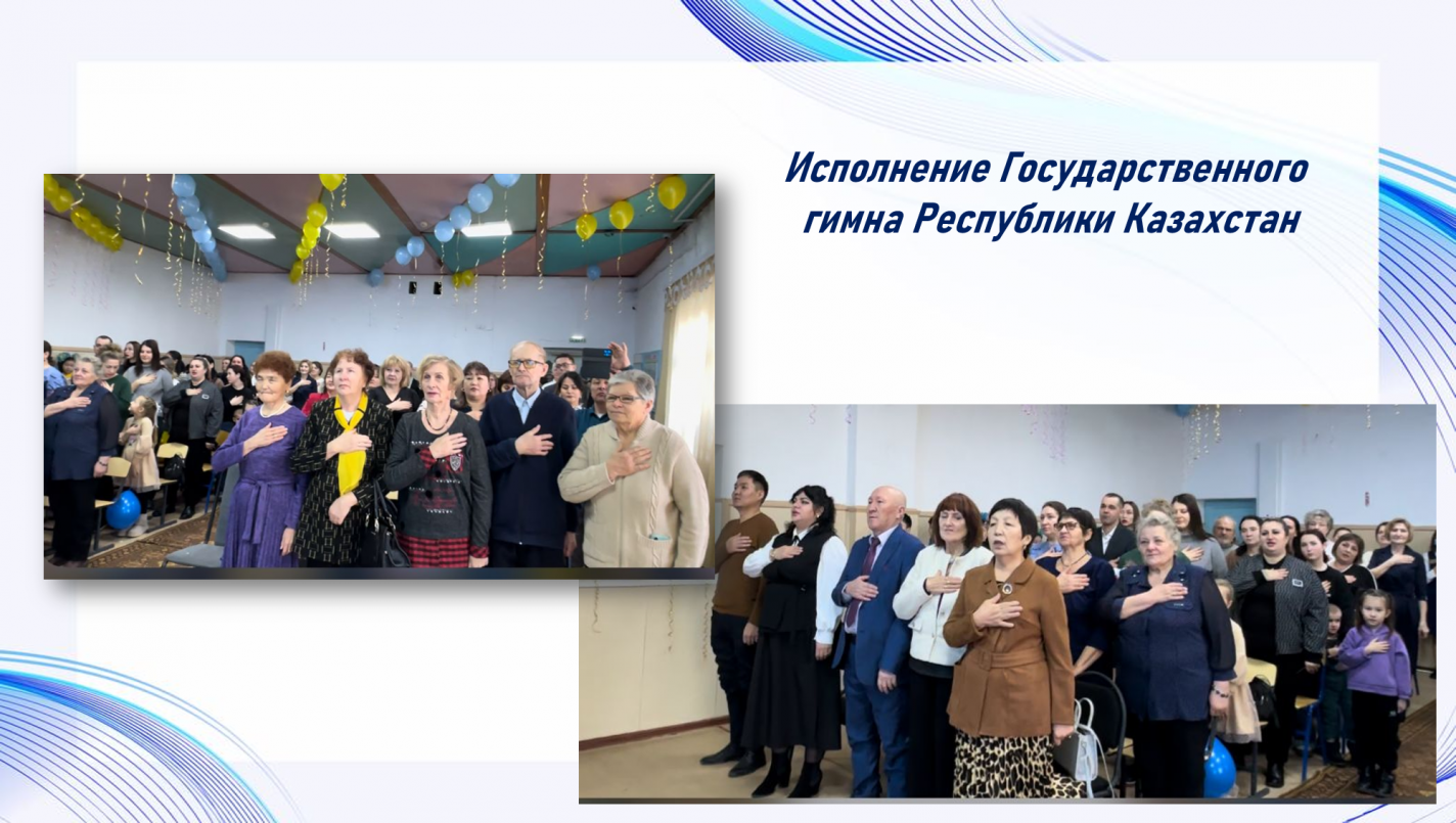 Торжественная часть началась с исполнения Государственного гимна Республики Казахстан. Затем с приветственным словом выступила директор школы Нина Анатольевна Меркер, которой было предоставлено право дать юбилейный школьный звонок. После этого гостям была вручена традиционная Шашу, как знак уважения и гостеприимства.